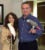 Laura Bryna with her birds (Snuggles and Tyler) and Tim Link